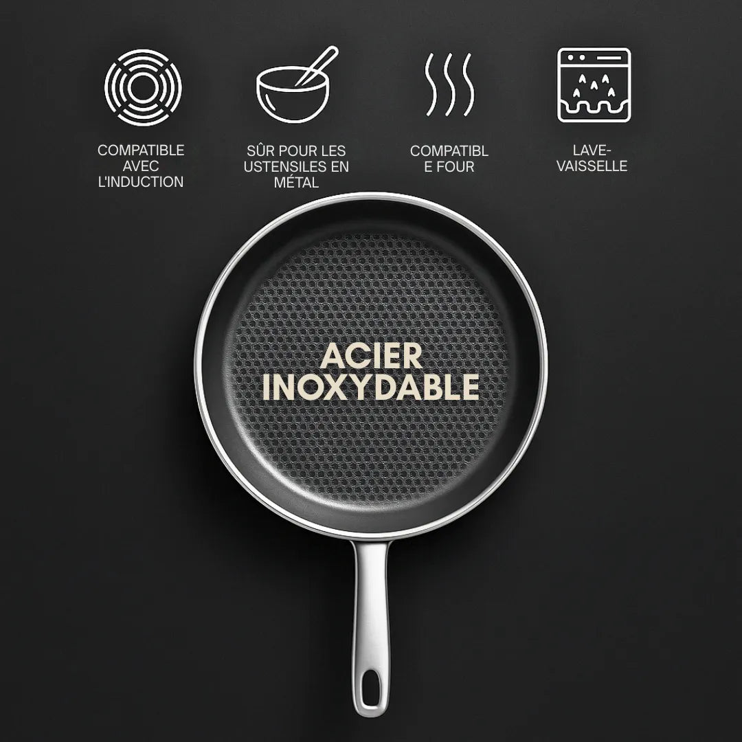 La structure multicouche en acier inoxydable garantit une excellente conduction thermique et une résistance exceptionnelle aux rayures. Compatible avec tous les feux, y compris l’induction, elle supporte une utilisation intensive sans se déformer ni ternir avec le temps.
