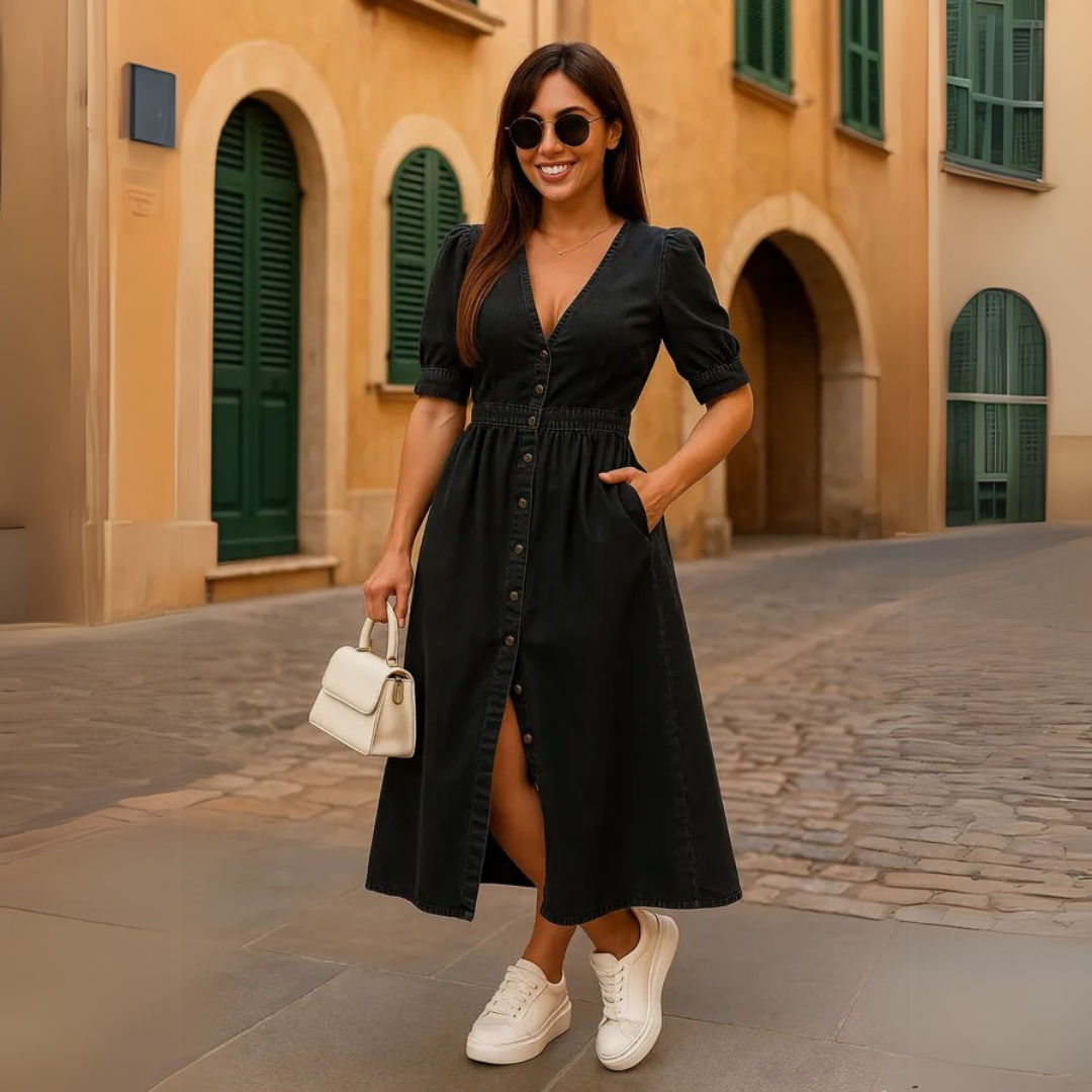 Cette robe en jean bleu offre un équilibre parfait entre décontraction et féminité. Avec son col en V, sa taille marquée et sa fermeture boutonnée sur toute la longueur, elle met en valeur la silhouette sans effort. Les manches nouées ajoutent une touche subtile de style, tandis que la fente avant assure une liberté de mouvement agréable au quotidien.