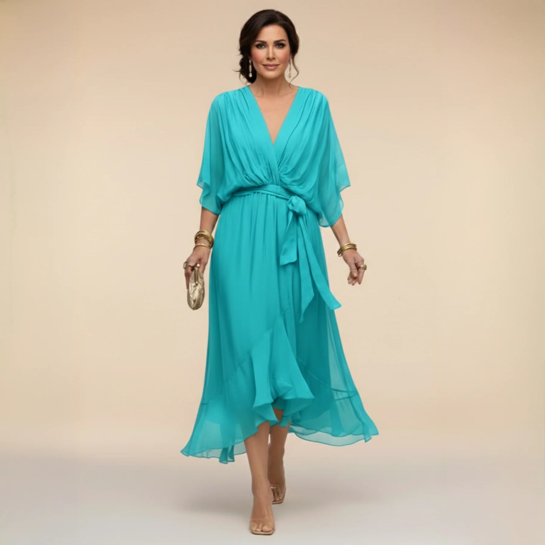 Cette robe en mousseline à col en V est un véritable symbole d'élégance et de confort. Sa coupe fluide et légère permet une liberté de mouvement, parfaite pour toutes les occasions spéciales. Avec son design intemporel et sa ceinture à nouer, elle met en valeur la silhouette tout en offrant un confort inégalé.