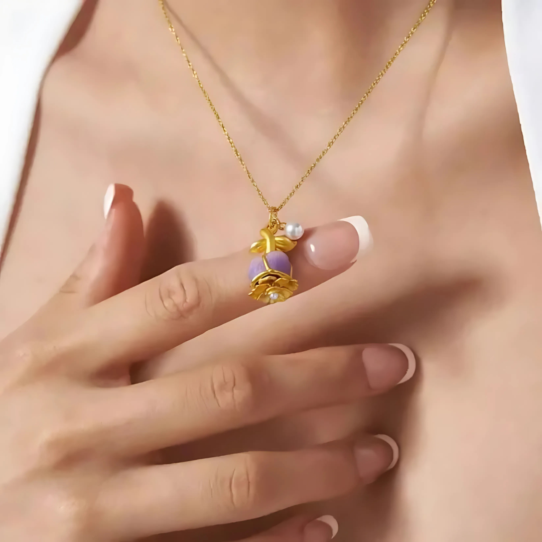 Diese Halskette vereint Eleganz und Symbolik in einem zeitlosen Design. Die kunstvoll gearbeitete Rose strahlt Wärme aus und erinnert an die Kraft echter Gefühle. Mit ihrer Farbveränderung von Violett zu Rosa wird sie zum Zeichen von Wandel und Liebe.
