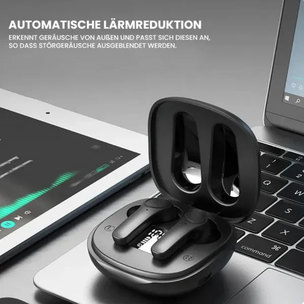 Ein LED-Display zeigt den Ladezustand des Etuis. Mit nur einem Tipp steuerst du Musik, Anrufe und Übersetzungen direkt am Kopfhörer. Die Akkulaufzeit reicht für mehrere Stunden, ideal für unterwegs.