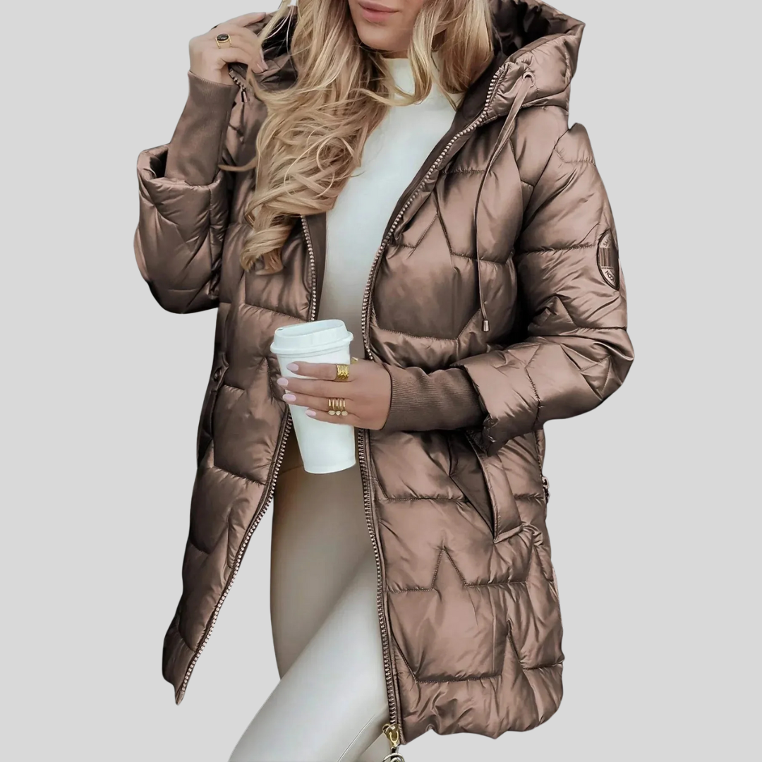 Cette veste longue matelassée offre une protection optimale contre le froid tout en conservant une allure féminine et moderne. Sa coupe ajustée met la silhouette en valeur, tandis que sa texture brillante ajoute une touche chic à vos tenues hivernales.