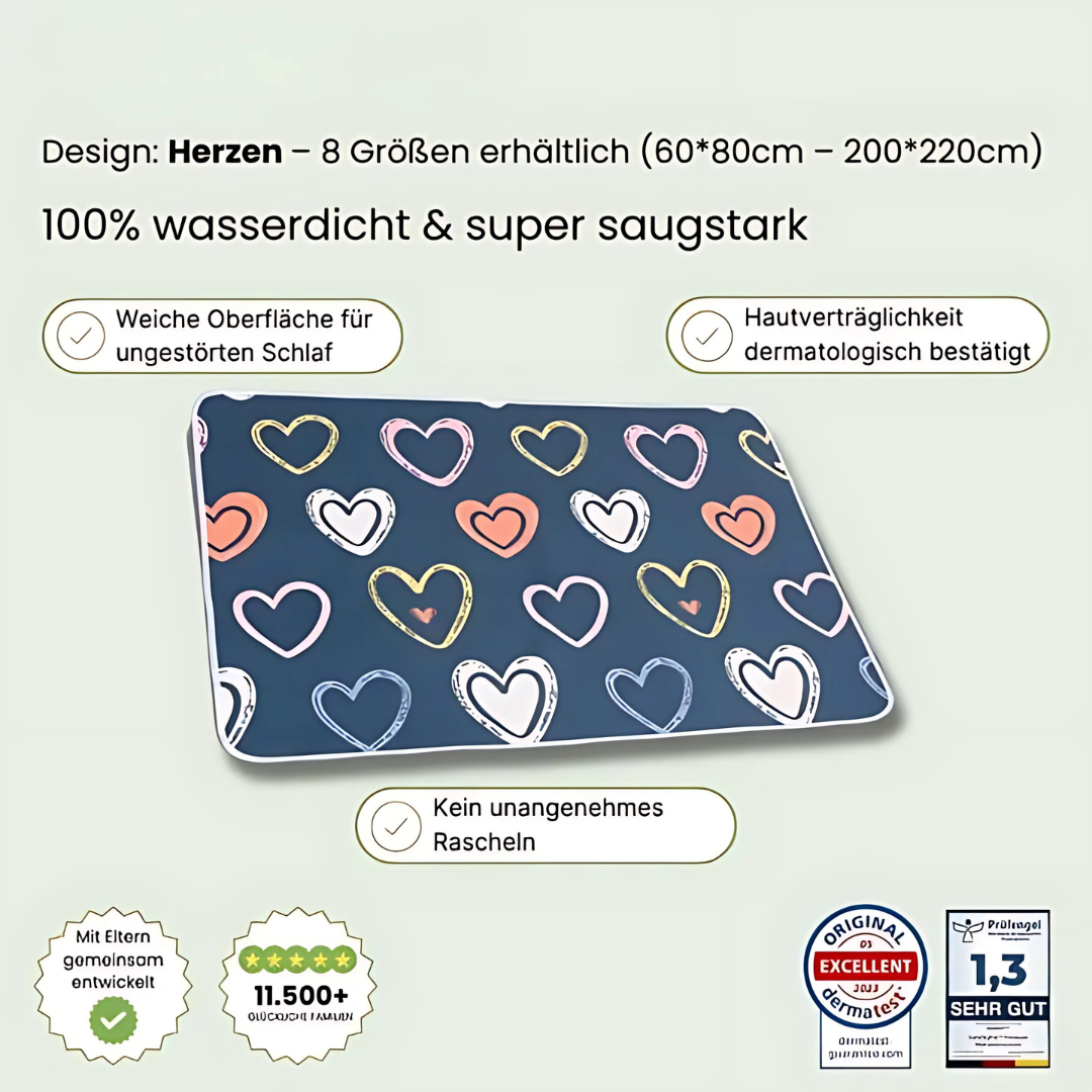 Das hautfreundliche Material ist besonders sanft und vermeidet Hautreizungen. Hergestellt aus zertifizierten, schadstofffreien Stoffen, garantiert dieser Schutz ruhige Nächte für Eltern und Kinder. Die Anti-Rutsch-Schicht sorgt dafür, dass alles an seinem Platz bleibt – selbst bei unruhigem Schlaf.