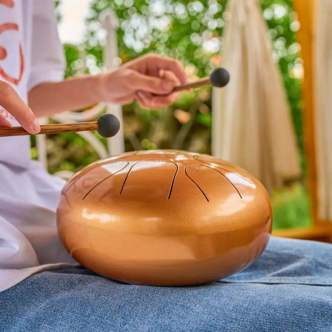 Ob zu Hause, im Yoga-Studio oder im Freien – diese Trommel schafft eine Atmosphäre der Ruhe und Konzentration. Einfach mit den Händen oder den beiliegenden Schlägeln spielen und in den Klang eintauchen.